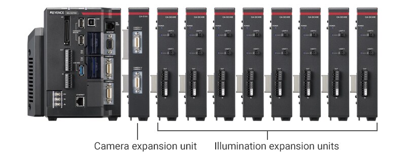 The LED light controllers can be connected directly to compatible vision systems with a minimal amount of wiring. The controllers enable direct illumination control and light strobing with image capture trigger inputs, without the need for a PLC. Up to 8 light expansion units * can be connected to a single vision system, allowing up to 16 lights to be controlled with ease.