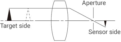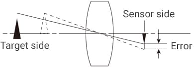 The CA-LM Series uses a group of front telecentric lenses to maintain a compact size and high performance. In spite of the small lens, the telecentric system maintains the target size regardless of vertical movement of the focal point. This is due to the targets principal ray being in parallel with the front lens optical axis resulting in little to no measurement error.